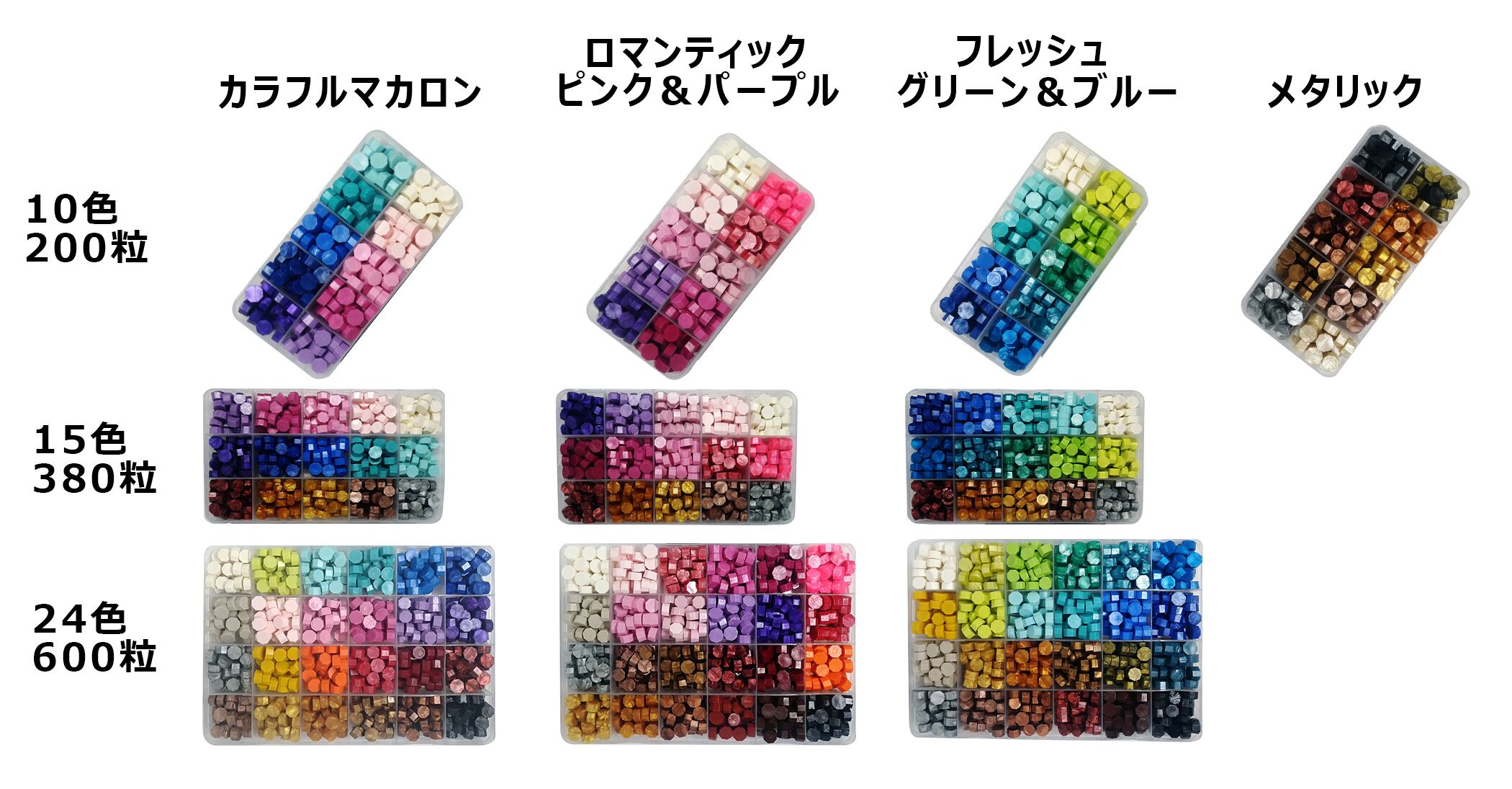 1粒8㎜程度のペレットタイプシーリングワックスです。25㎜径のスタンプに3個程度が適量です。24色×25粒程度の約600粒入り