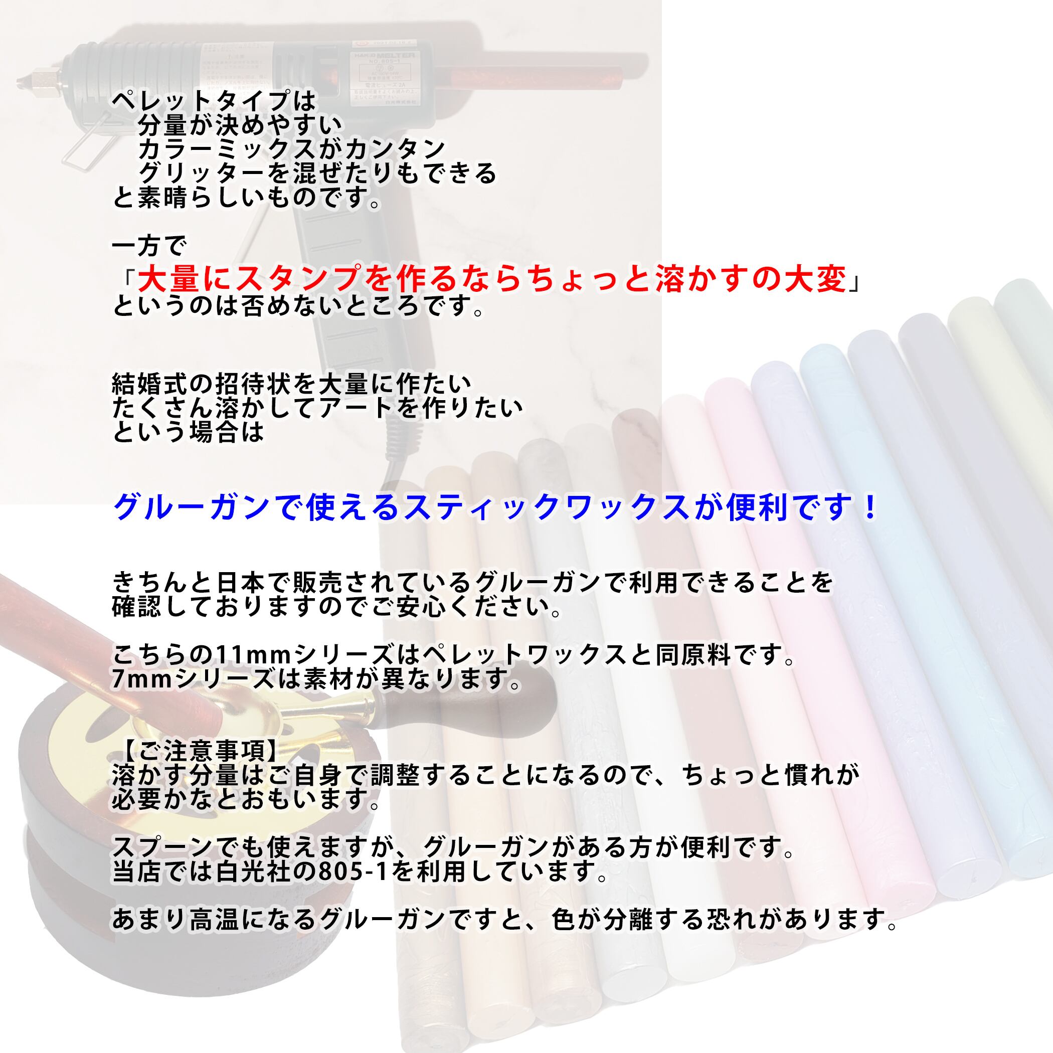 スプーン上で溶かすこともできますが、グルーガンをご利用いただければ、とても楽にスタンプを作れるので、オススメです。当店では白光社の805-1を利用しています。